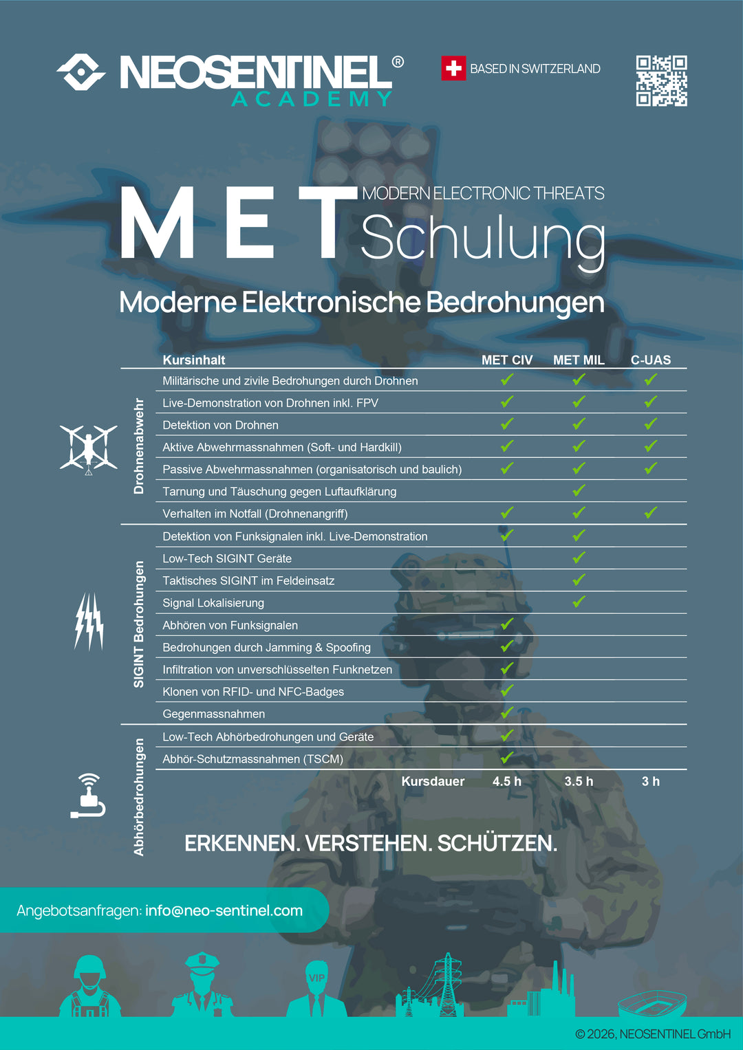 Elektronische Bedrohungen haben sich in den vergangenen Jahren zu einem zentralen Faktor für Sicherheit und Einsatzplanung entwickelt. Sie wirken oft unsichtbar und unbewusst, können jedoch fatale Folgen haben. Durch kurze Innovationszyklen entwickeln sich diese Bedrohungen rasant weiter und betreffen Militär, zivile Sicherheitskräfte, kritische Infrastrukturen, Grossunternehmen, Grossveranstaltungen und Schutzpersonen.