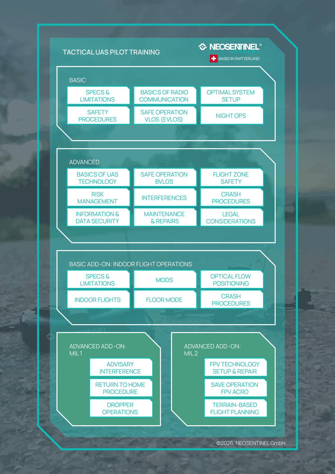 Wir bieten spezialisierte Schulungen für Polizei- und Militärangehörige an, die unbemannte Systeme bedienen, wobei der Schwerpunkt sowohl auf der technischen Kompetenz als auch auf der taktischen Anwendung liegt.