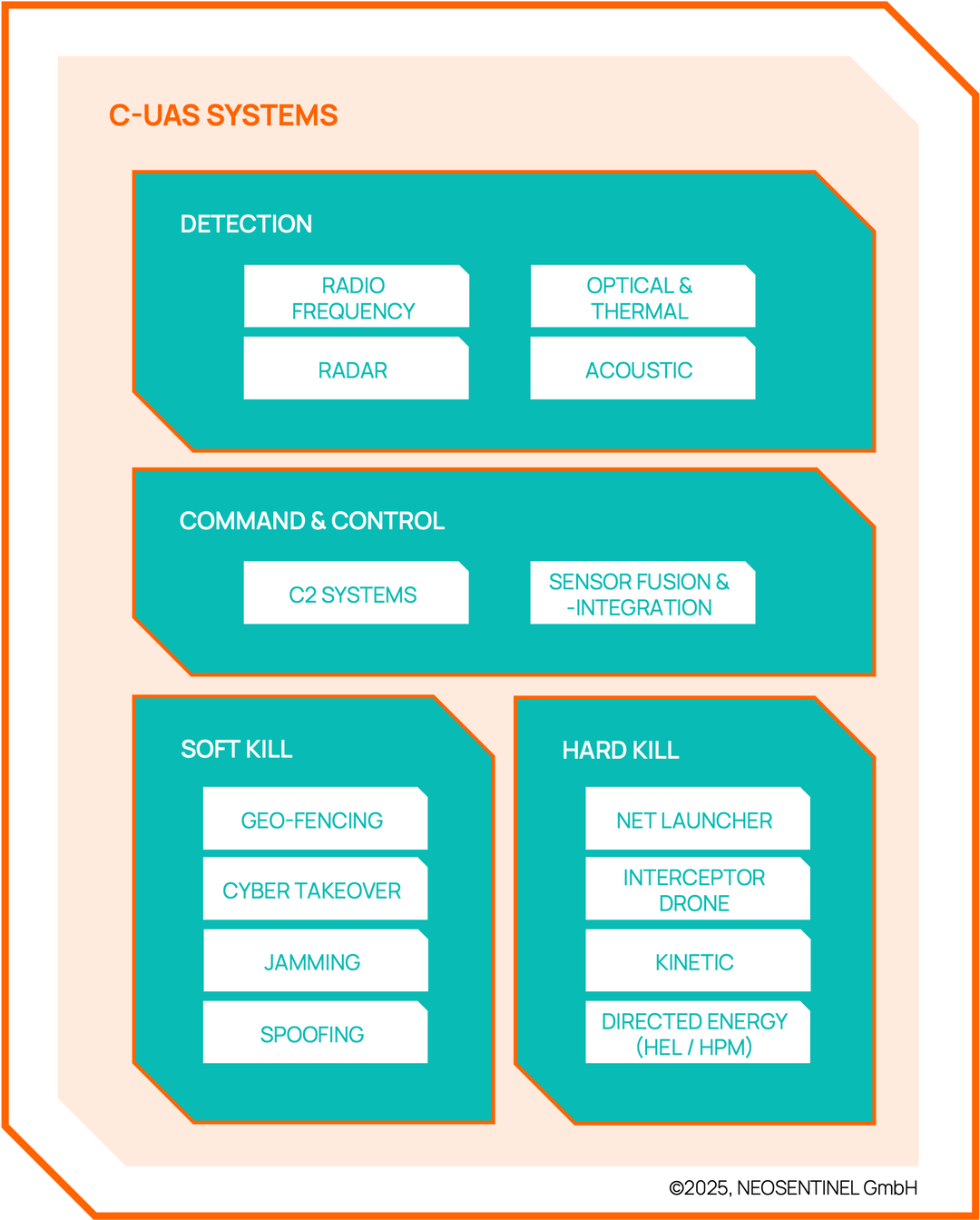 • HARD KILL – Kinetic countermeasures intended to physically neutralise hostile drones when soft kill options are ineffective or unsuitable, within defined legal and operational constraints.